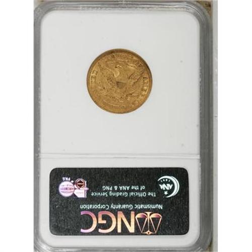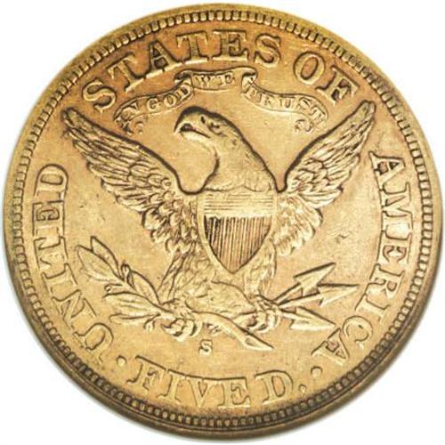 <B>1872-S $5 AU53 NGC.</B></I> An original orange-gold representative that has well struck peripheral elements and moderate softness on the eagle's neck and on the curls near the ear. Generally smooth despite a small cluster of marks beneath the right (facing) wing. From a low mintage of 36,400 pieces, from which there are likely fewer than 200 survivors. Census: 15 in 53, 25 finer (11/07).<BR><BR><B>Coin Engraver:</B> Christian Gobrecht<BR><BR><b>Shipping:</b> Coins & Currency (<a target="_blank" href="http://www.heritageauctions.com/common/shipping.php">view shipping information</a>)