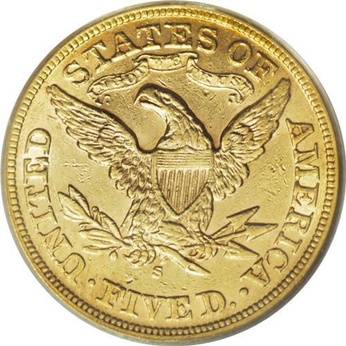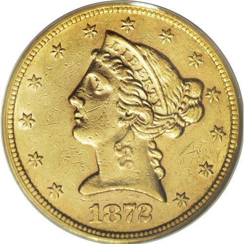 1872-S $5 AU55 PCGS. The 1872-S half eagle, with a min