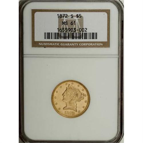 <B>1872-S $5 MS61 NGC.</B></I> Jeff Garrett and Ron Guth (2006) write that the 1872-S half eagle is a very rare issue in any grade. The NGC/PCGS population figures confirm this, and indicate that most survivors seem to be in the Extremely Fine to About Uncirculated grade range. A mere three Mint State pieces have been seen, all MS61 NGC-graded.<BR> Lustrous brassy-gold surfaces abound on this Uncirculated example, and the semi-prooflike fields highlight the motifs. An attentive strike brings out sharp definition on the design elements, save for minor softness in the arrow feathers and the eagle's neck feathers. Light, inoffensive handling marks evenly scattered about preclude a higher grade.<BR><BR><B>Coin Engraver:</B> Christian Gobrecht<BR><BR><b>Shipping:</b> Coins & Currency (<a target="_blank" href="http://www.heritageauctions.com/common/shipping.php">view shipping information</a>)