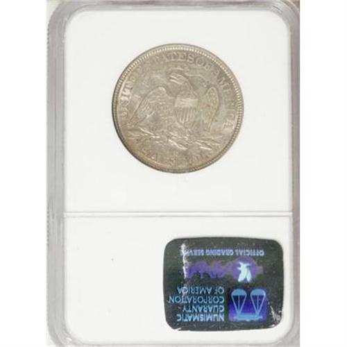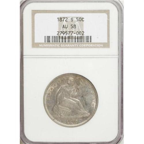 <B>1872-S 50C AU58 NGC.</B></I> A strongly lustrous and well-defined example of this desirable S-mint silver minor, predominantly peach- and gold-toned with a touch of pink. Near-Mint and finer survivors are condition rarities, as minor coins were in heavy demand at the time. Census: 3 in 58, 15 finer (10/07).<BR><BR><B>Coin Engraver:</B> Christian Gobrecht<BR><BR><b>Shipping:</b> Coins & Currency (<a target="_blank" href="http://www.heritageauctions.com/common/shipping.php">view shipping information</a>)