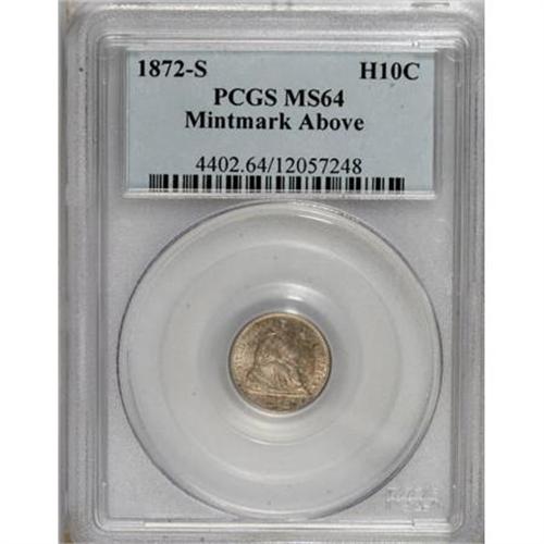 <B>1872-S H10C Mintmark Above Bow MS64 PCGS.</B></I> PCGS Population (26/33). NGC Census: (0/0). Numismedia Wsl. Price for NGC/PCGS coin in MS64: $350. (#4402)<BR><BR><B>Coin Engraver:</B> Christian Gobrecht<BR><BR><b>Shipping:</b> Coins & Currency (<a target="_blank" href="http://www.heritageauctions.com/common/shipping.php">view shipping information</a>)