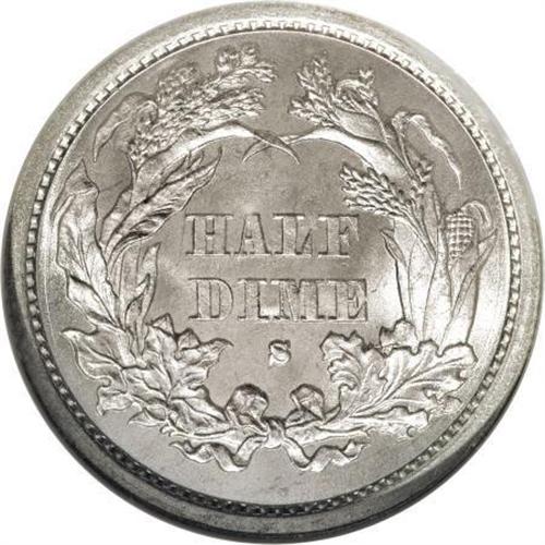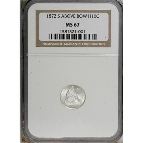 <B>1872-S H10C Mintmark Above Bow MS67 NGC.</B></I> Beginning in 1870, and continuing to the middle of 1872, mintmarks were placed inside the wreath on the half dimes, reverting back to the previous position below the wreath for the remainder of 1872 and all of 1873. This example, a pristine Superb Gem, has bold design features and frosty luster. Both sides have bright silver surfaces with no evidence of toning. Census: 3 in 67, 0 finer (6/07).<BR><BR><b>Shipping:</b> Coins & Currency (<a target="_blank" href="http://www.heritageauctions.com/common/shipping.php">view shipping information</a>)