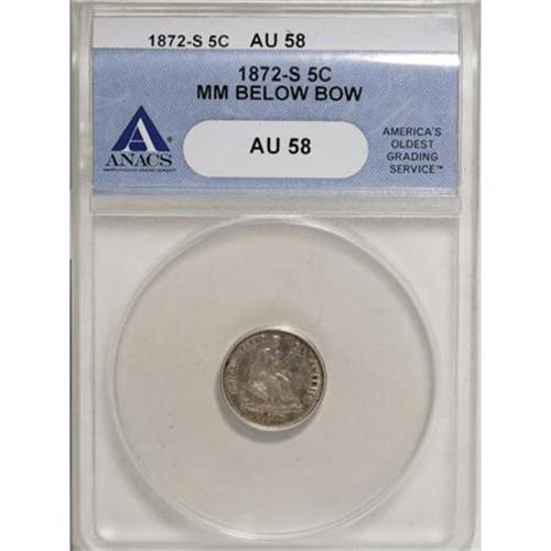 <B>1872-S H10C Mintmark Below Bow AU58 ANACS.</B></I> NGC Census: (0/625). PCGS Population (0/580). Mintage: 837,000. Numismedia Wsl. Price for NGC/PCGS coin in AG3 : $6. (#4401)<BR><I>From The Al Blythe Collection of Half Dimes.</B></I><BR><BR><B>Coin Engraver:</B> Christian Gobrecht<BR><BR><b>Shipping:</b> Coins & Currency (<a target="_blank" href="http://www.heritageauctions.com/common/shipping.php">view shipping information</a>)