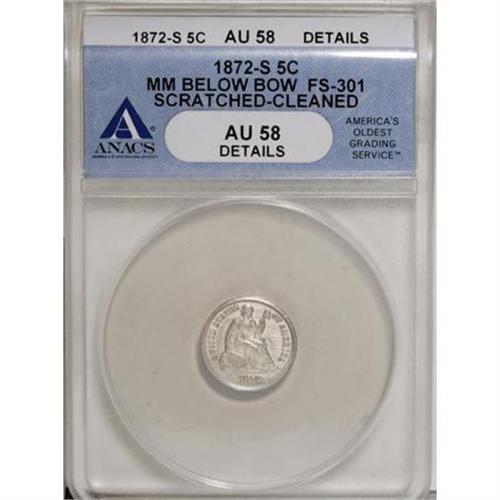 <B>1872-S H10C Mintmark Below Bow--Cleaned, Scratched--ANACS AU58 Details.</B></I> FS-301. NGC Census: (51/558). PCGS Population (52/505). Mintage: 837,000. Numismedia Wsl. Price for NGC/PCGS coin in AU58: $80. (#4401)<BR><I>From The Al Blythe Collection of Half Dimes.</B></I><BR><BR><B>Coin Engraver:</B> Christian Gobrecht<BR><BR><b>Shipping:</b> Coins & Currency (<a target="_blank" href="http://www.heritageauctions.com/common/shipping.php">view shipping information</a>)