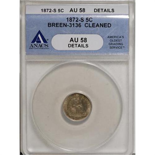 <B>1872-S H10C Mintmark Below Bow--Cleaned--ANACS AU58 Details.</B></I> Breen-3136. NGC Census: (51/558). PCGS Population (52/505). Mintage: 837,000. Numismedia Wsl. Price for NGC/PCGS coin in AU58: $80. (#4401)<BR><I>From The Al Blythe Collection of Half Dimes.</B></I><BR><BR><B>Coin Engraver:</B> Christian Gobrecht<BR><BR><b>Shipping:</b> Coins & Currency (<a target="_blank" href="http://www.heritageauctions.com/common/shipping.php">view shipping information</a>)