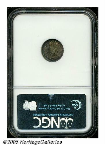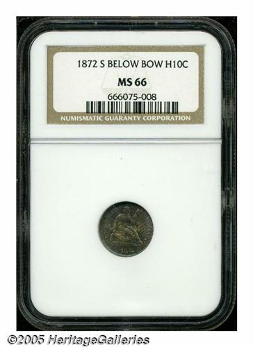 <B>1872-S<H10C> Mintmark Below Bow MS66 NGC.</B></I> Sharply struck with fully lustrous, entirely unblemished, richly toned surfaces that display deep champagne-red and cobalt-blue coloration, completely blanketing each side of the piece. A partial fingerprint fragment, on the right side of the obverse, is the only mentionable flaw, and seems relatively minor considering the overall merit of this visually enticing premium quality Gem. Population: 49 in 66, 6 finer (5/05).