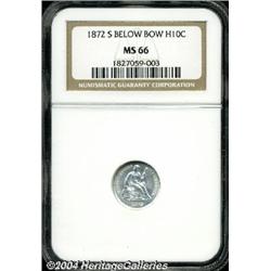 <B>1872-S<H10C> Mintmark Below Bow MS66 NGC.</B></I> A well struck, nearly untoned, and magnificently preserved premium Gem. Equal in scarcity to the variety with the mintmark inside the wreath. The top of the D in UNITED is open on this example, which also exhibits faint clash marks (as made) on the reverse. <BR><BR><B>Important notice:</B> Heritage usually auctions material at the rate of 200-250 lots per hour. On some occasions eBay Live bid software or the Internet may not be able to keep up with the pace of the auction. We recommend placing a realistic absentee bid now as insurance to avoid disappointment. Occasionally the auctioneer may eliminate or reject an eBay Live bid, and the auctioneer may also reopen a lot after the close of the eBay live bidding (usually because we missed an audience bid), and may reject your bid even if it shows you as the winning bidder. By bidding via eBay Live, you agree that Heritage may award the lot to another bidder at its sole discretion under the circumstances described above or any other reasonable circumstances. Since eBay bids are not shown to us until we open the lot on the floor, we treat those bids just like floor bids. In most cases the floor responds before the eBay bid is presented to us, due to Internet lag time, so for consistency we have made it a policy that floor bids are always considered first over tie eBay live bids. Also please note that all Heritage lots purchased through eBay Live carry a 20% Buyer's Premium. Please make sure you read the Terms and Conditions before you bid.