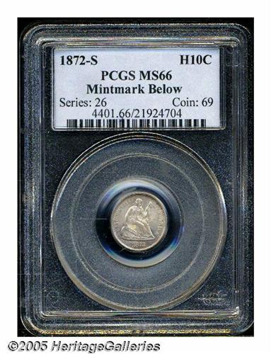 <B>1872-S<H10C> Mintmark Below Bow MS66 PCGS.</B></I> Undulating light violet and blue surfaces, attractive luster, and the eye appeal expected of a Superb-Gem survivor.
