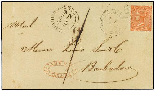 1872 ST. THOMAS a BARBADOS. Circulada con sello inglés de 4 p. bermellón, mat. duplex de la B.P.O. de ST. THOMAS y llegada a Barbados en el frente. Magnífica y rara destinación para una carta desde St. Thomas.