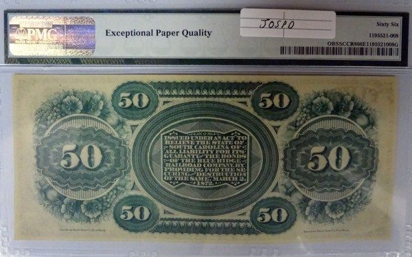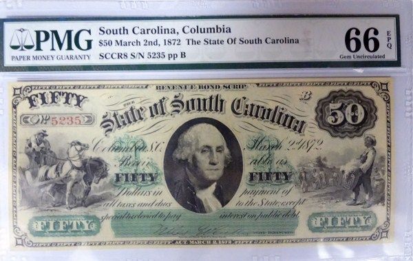 1872 STATE OF SOUTH CAROLINA $50.00 NOTE PMG 66EPQ, SUPER, AND RARE!