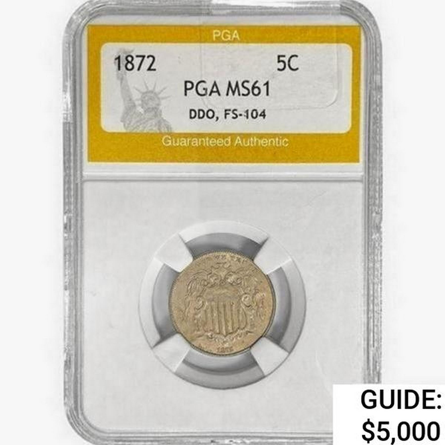 1872 Shield Nickel PGA MS61 DDO, FS-104