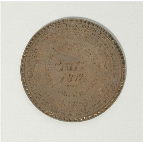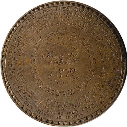 <B>1872 The Apostles' Creed Hand-Engraved on U.S. Large Cent.</B></I> <I>Fantastic</B></I> and <I>unbelievable</B></I> are some of the words that describe this coin, a no-date large cent that has The Apostles' Creed skillfully hand-engraved on the planed-off obverse, by S. Hodgkiss, June 20, 1872. We cannot even imagine how long this took, but by today's standard what would one have to pay someone to create this? This piece may have special meaning for many collectors.<BR><BR><b>Shipping:</b> Coin/Currency (<a target="_blank" href="http://www.heritageauctions.com/common/shipping.php">view shipping information</a>)