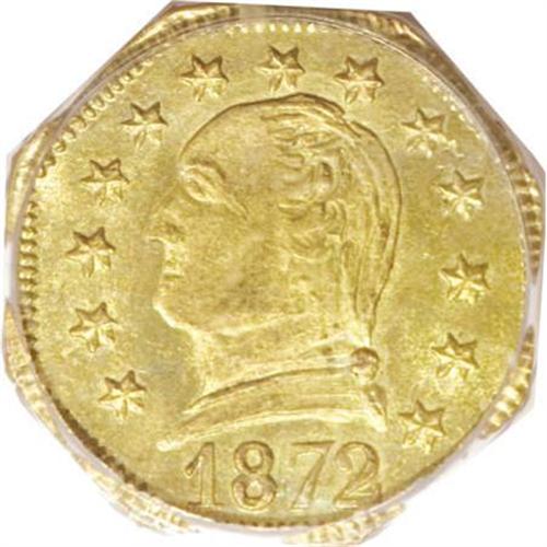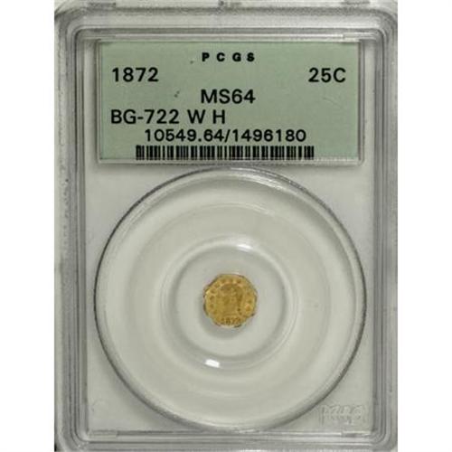 <B>1872 25C Washington Octagonal 25 Cents, BG-722, Low R.4, MS64 PCGS.</B></I> This is an attractive near-Gem with yellow-gold fields imbued with tinges of light green. The lustrous surfaces exhibit evenly struck design elements that are solidly defined. The coin shows a medallic alignment, and the upper borders are wavy, as ejected from the die. Housed in a green label holder.<BR><BR><b>Shipping:</b> Coins & Currency (<a target="_blank" href="http://www.heritageauctions.com/common/shipping.php">view shipping information</a>)