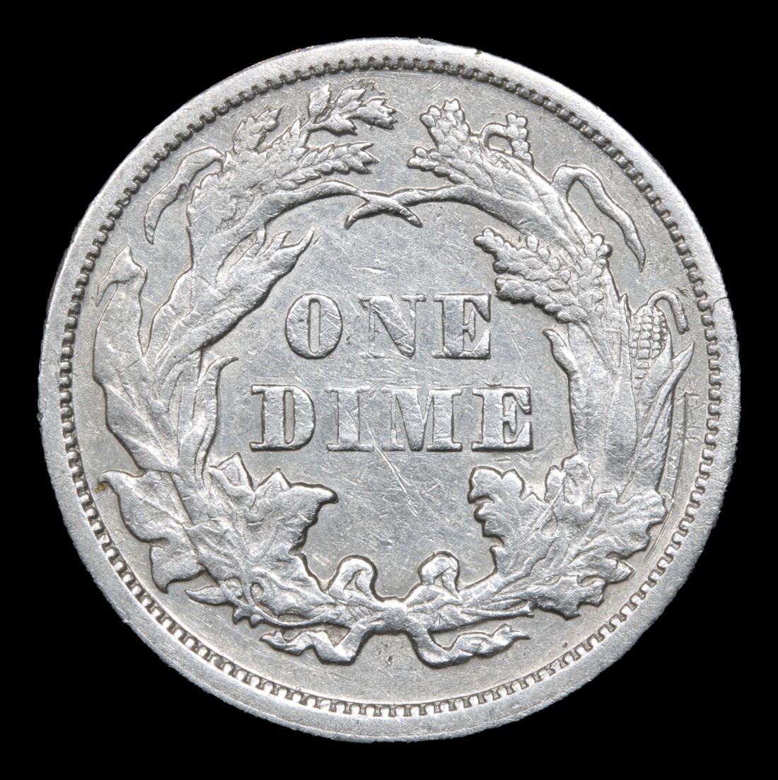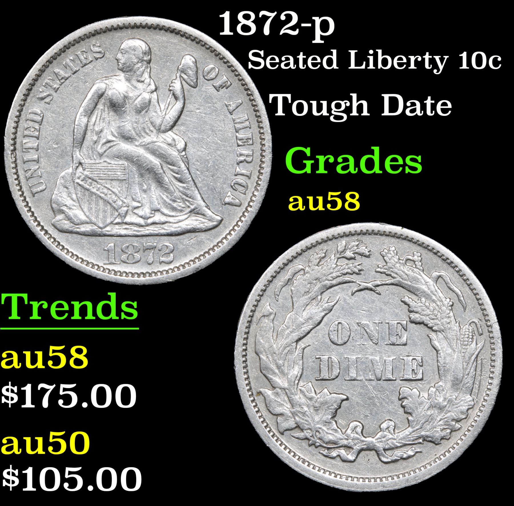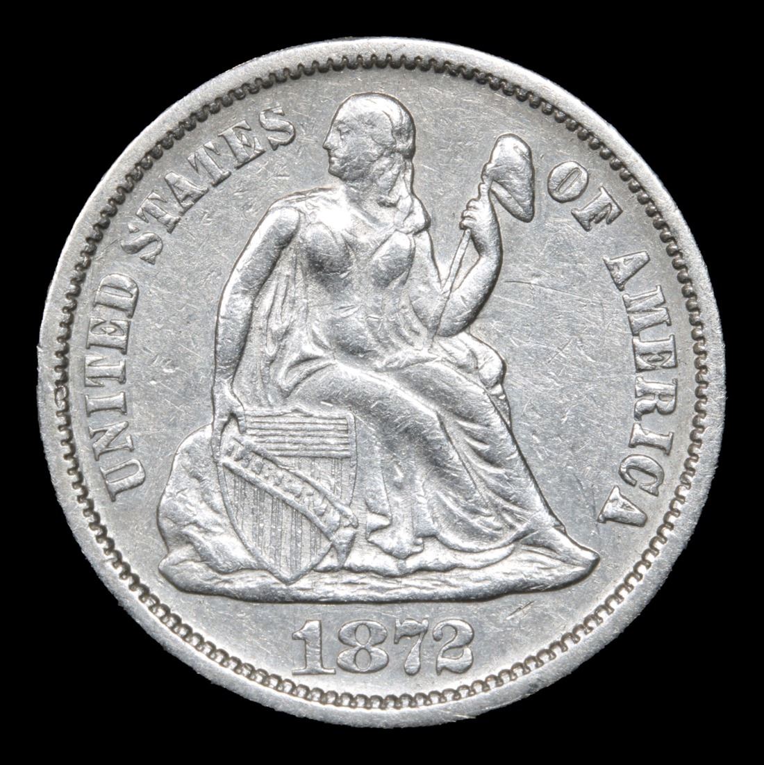 1872-p Seated Liberty Dime 10c Grades Choice AU/BU Slider. Tough Date
