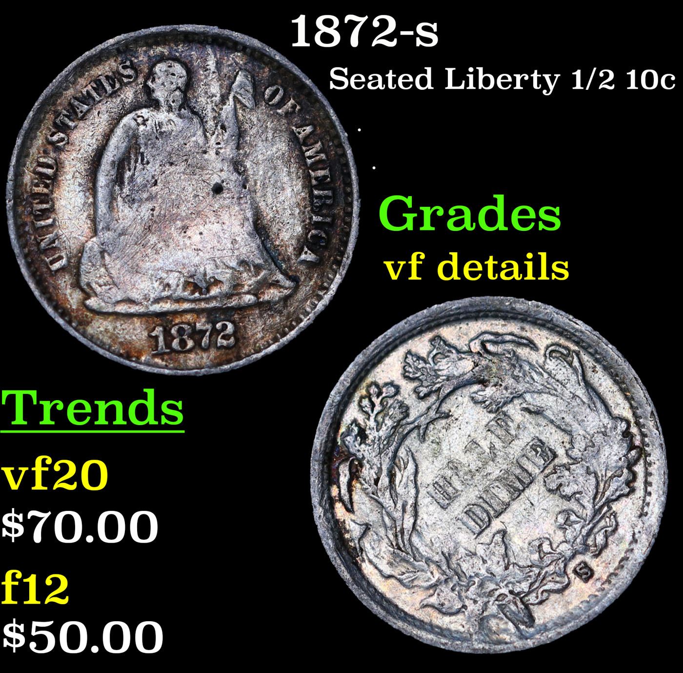 1872-s Seated Liberty Half Dime 1/2 10c Grades vf details.