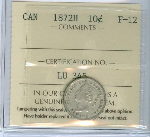 1872H 10¢ ICCS F12. A nice key date coin with problem free