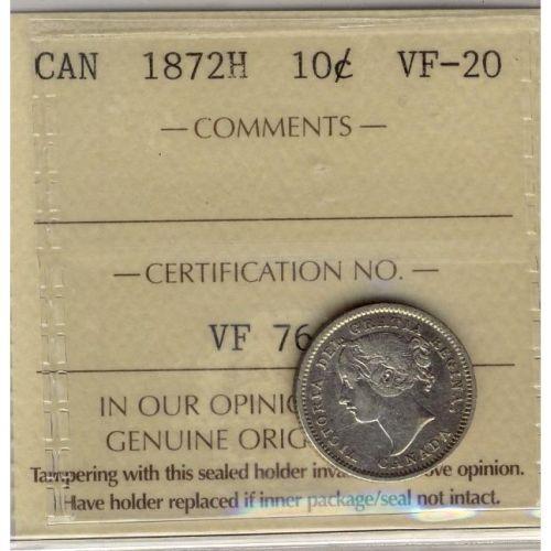 1872H 10¢ ICCS VF-20, brilliant with some lustre. A nice example