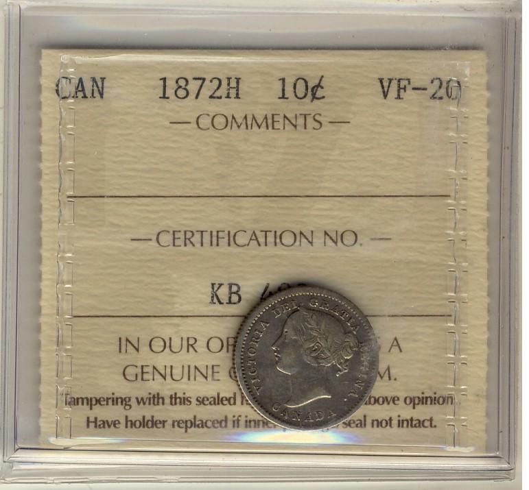 1872H 10¢ ICCS VF20. Key issue.