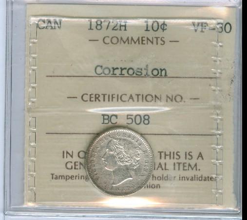 1872H 10¢ ICCS VF30. Designated corrosion.