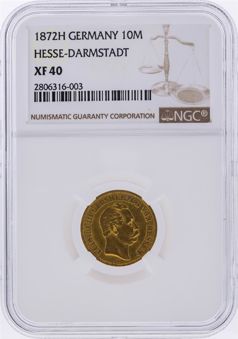 One 1872H 10M Germany Hesse-Darmstadt Gold Coin NGC XF40. NGC Certified.
