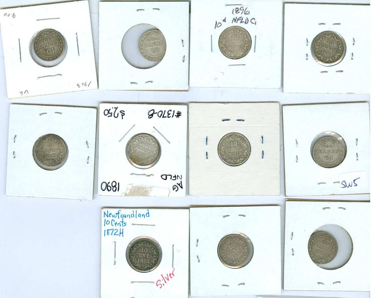 1872H-1904H Nfld 10¢. Lot of 11 coins including, 1872H(2),