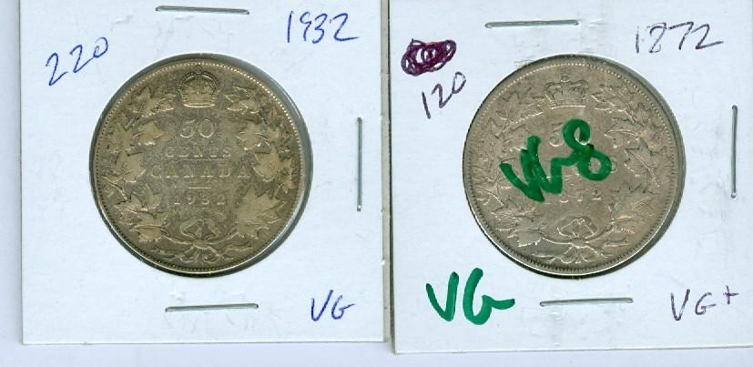 1872H & 1932 50¢. Lot of 2 coins both VG.