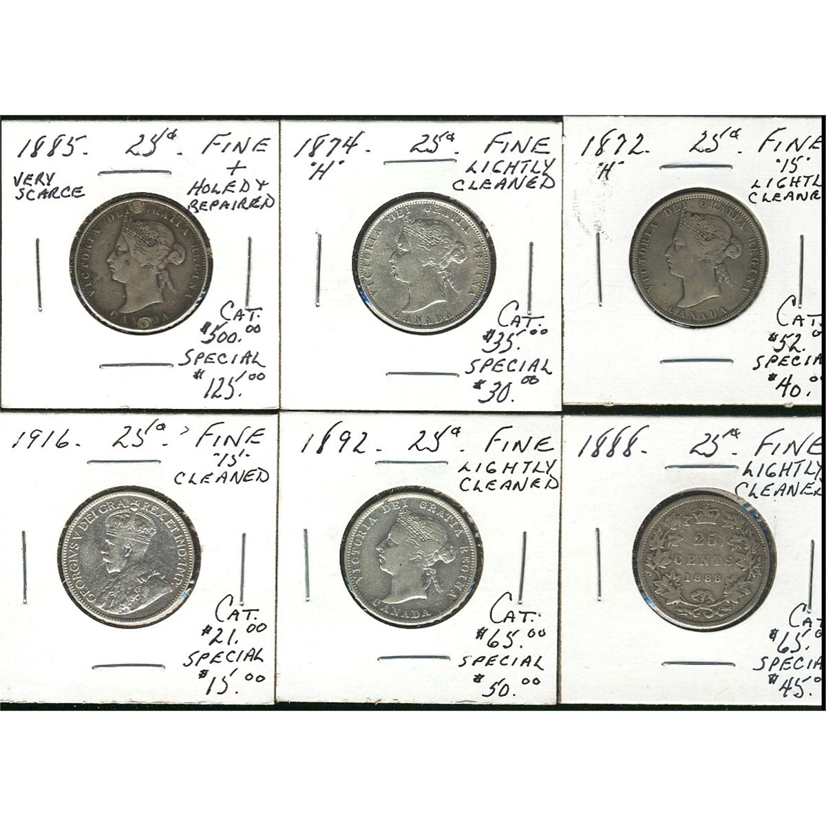 1872H 25¢, 1874H, 1885, 1888, 1892 & 1916. Lot of 6 coins all Fine or better and cleaned. (PBA).