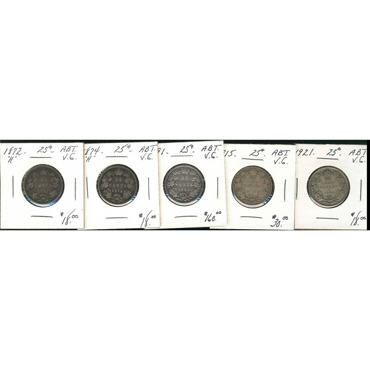 1872H 25¢, 1874H, 1891, 1915 & 1921. Lot of 5 coins all abt VG. (PBA).