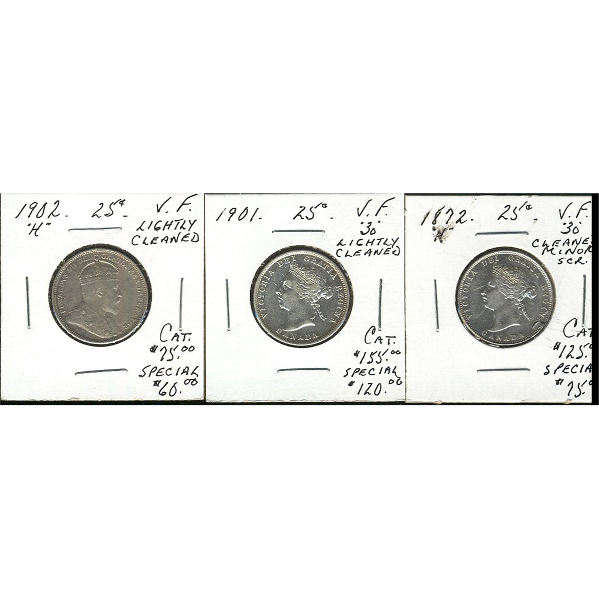 1872H 25¢, 1901 & 1902H VF or better all with problems. (PBA).