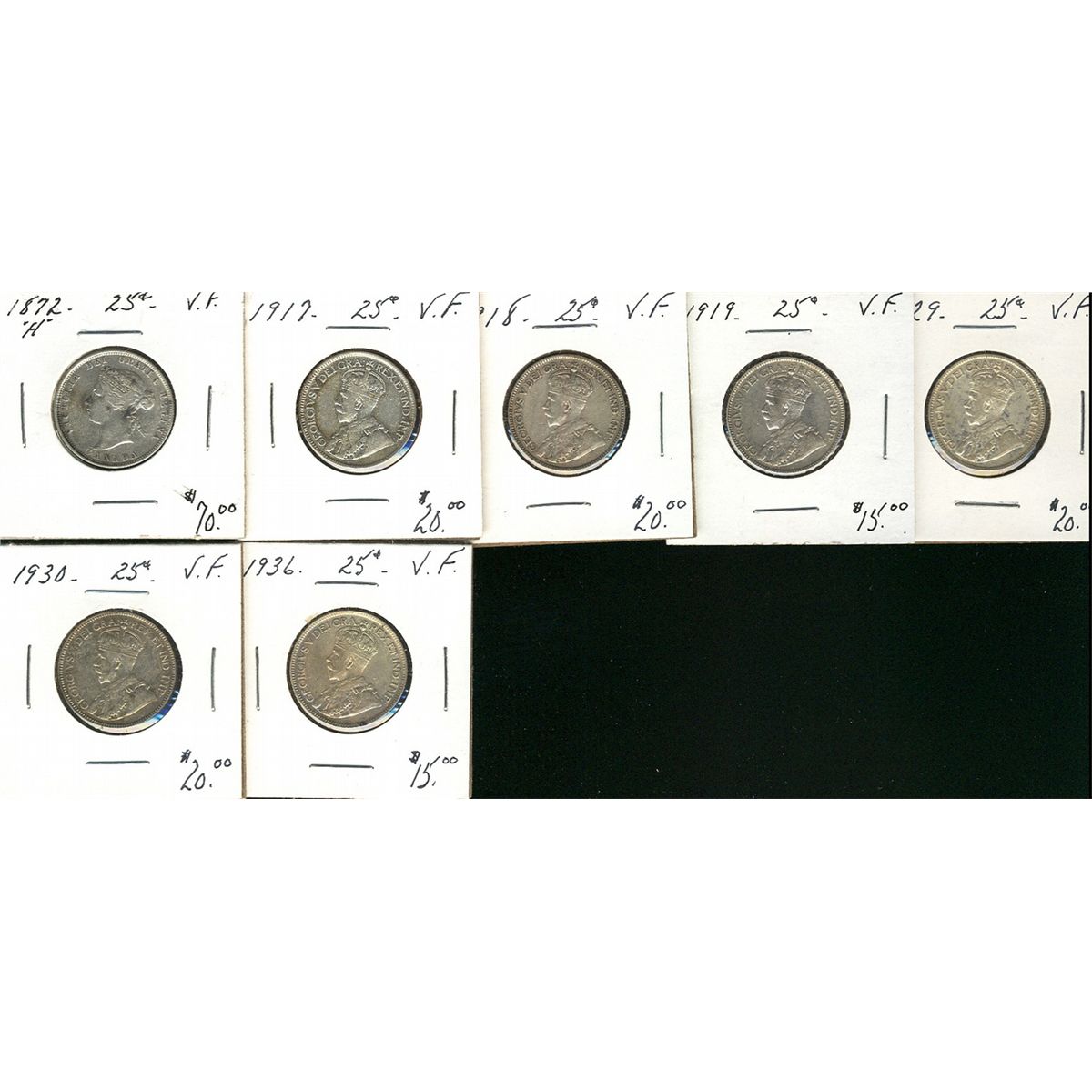 1872H 25¢, 1917, 1918, 1919, 1929, 1930 & 1936. Lot of 7 coins all VF. (PBA).