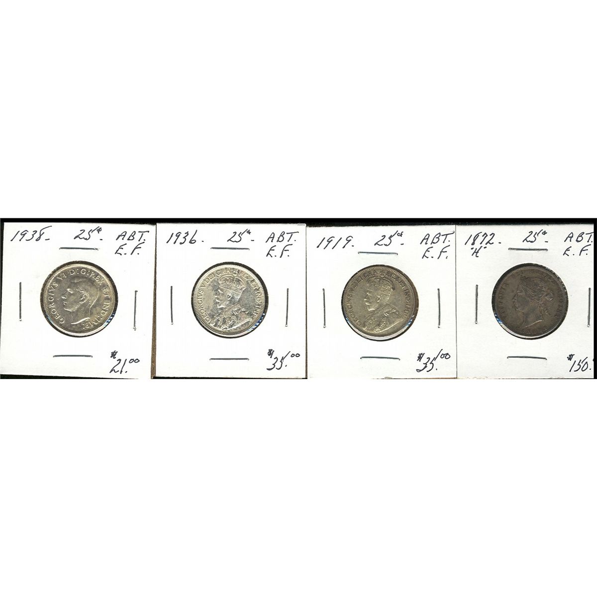 1872H 25¢, 1919, 1936 & 1938. Lot of 4 coins all Abt EF.