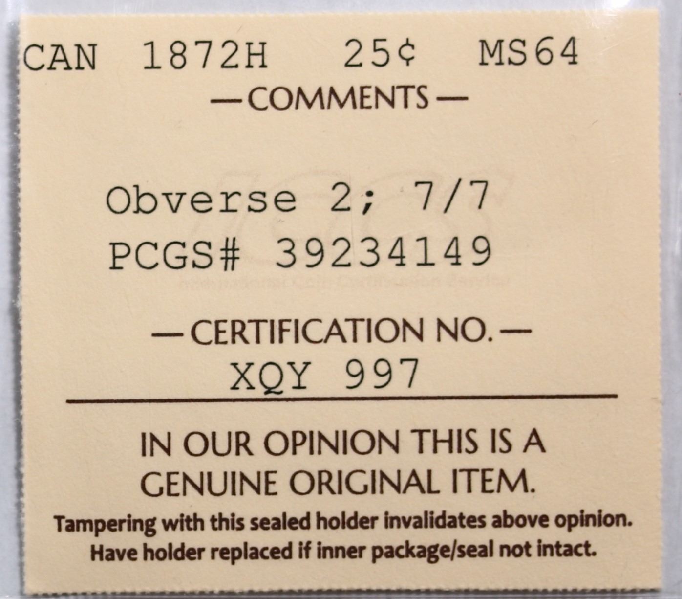 The cataloguer has taken every reasonable measure to ensure that all of the lots in this sale are as described and genuine. All raw coins and banknotes have been graded by the cataloger or the auction house which represent our best professional opinion. To grade coins and banknotes, we use Canadian grading standards, 42 years of experience and good conscience. However, grading is a subjective description in the opinion of the cataloger or the auction house. Among experts there are often differences of opinion on the grading and the eye appeal of a coin. The strike and the state of preservation are often debated. The Canadian Numismatic Company acts as an agent between consignors and buyers. The Canadian Numismatic Company does not guarantee that any coin or banknote cataloged will meet the standards, or the grade, of any third party grading companies. No warranty, whether impressed or implied. Items are as is, no warranty given. We cannot accept responsibility and waive all liability resulting in financial losses, and or incidentals accruing from the sale of any items, nor can we guarantee that items graded by third party services will grade the same if submitted to a different grading service or re-submitted to the same company. Statements by The Canadian Numismatic Company regarding the condition, the eye appeal, the strike and the population of items are for guidance only. All lots offered are sold "AS IS". Title to all lots remains with the auction house until paid for in full by the purchaser. But they are held at the risk of the purchaser once the time of the sale.