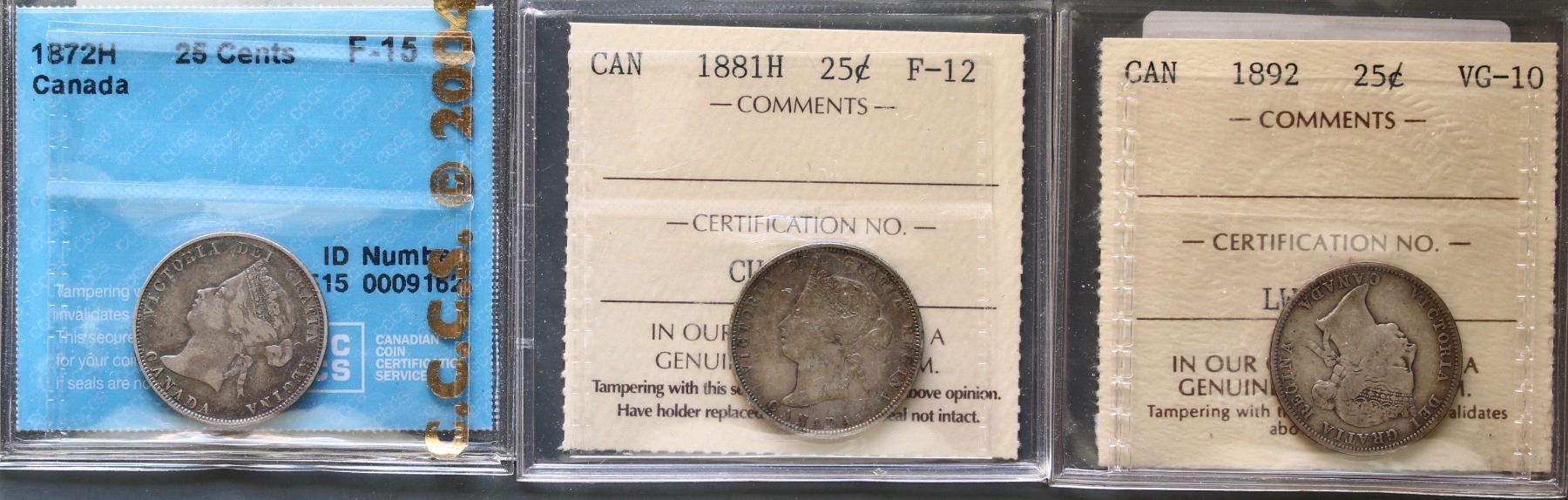 1872H 25¢ CCCS Choice Fine-15, 1881H ICCS Fine-12 & 1892 ICCS Very Good-10. Lot of 3 graded coins.