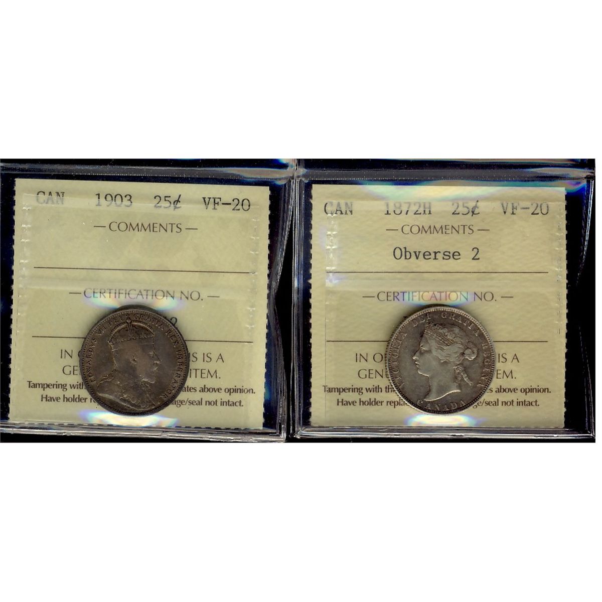 1872H 25¢ Obv 2 & 1903 ICCS VF20. Lot of 2 coins.