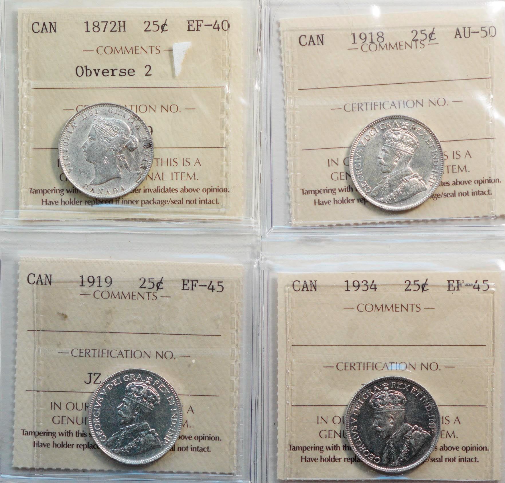 1872H 25¢ "Obv 2", 1918, 1919, 1934. Lot of 4 coins ICCS Extra Fine-40 to About Uncirculated-50