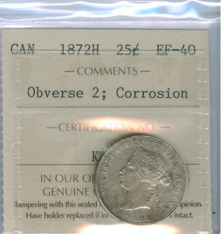 1872H 25¢ Obv 2 ICCS EF40. Designated as corroded.