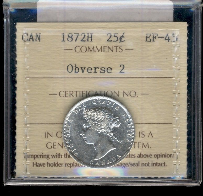 1872H 25¢ Obv 2 ICCS EF45.