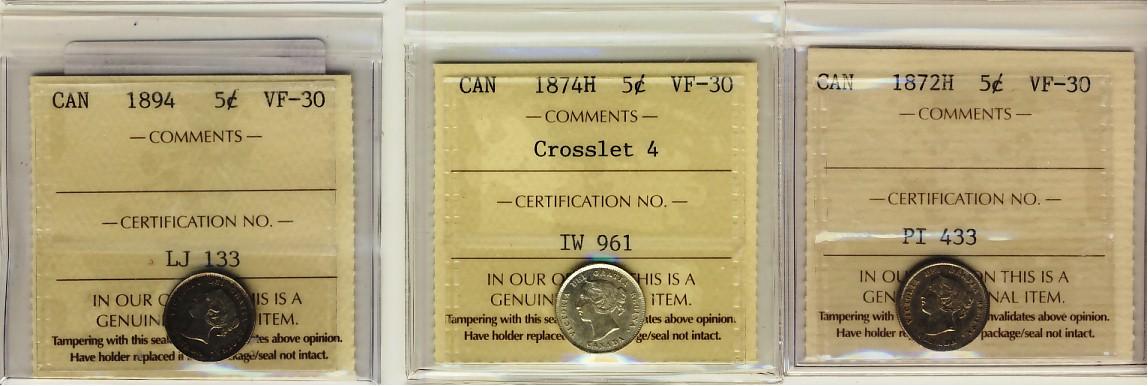 1872H 5¢, 1874H Crss & 1894 ICCS VF30. Lot of 3 coins.