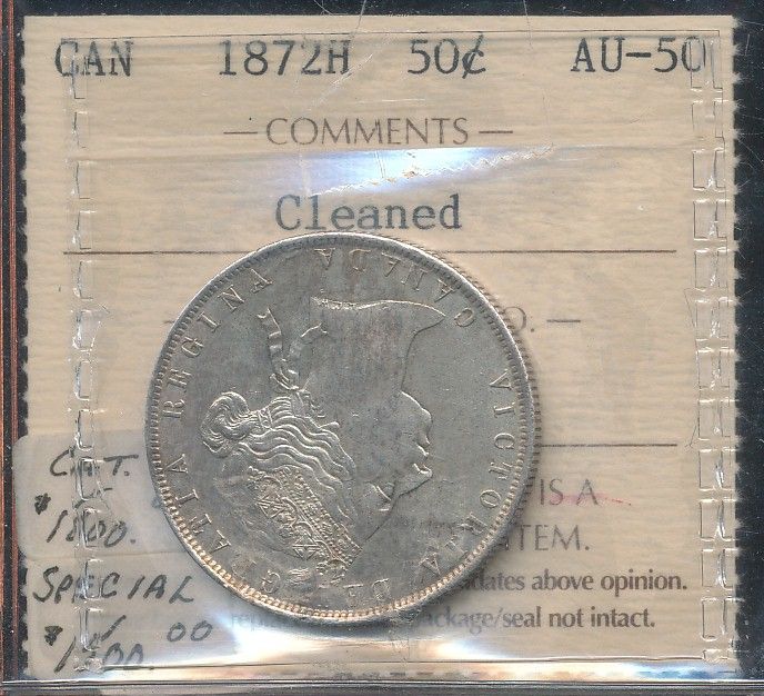 1872H 50¢ ICCS AU50. Designated cleaned.