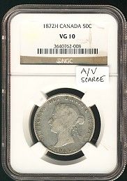 1872H 50¢ NGC VG10. Should be designated as A/V variety.