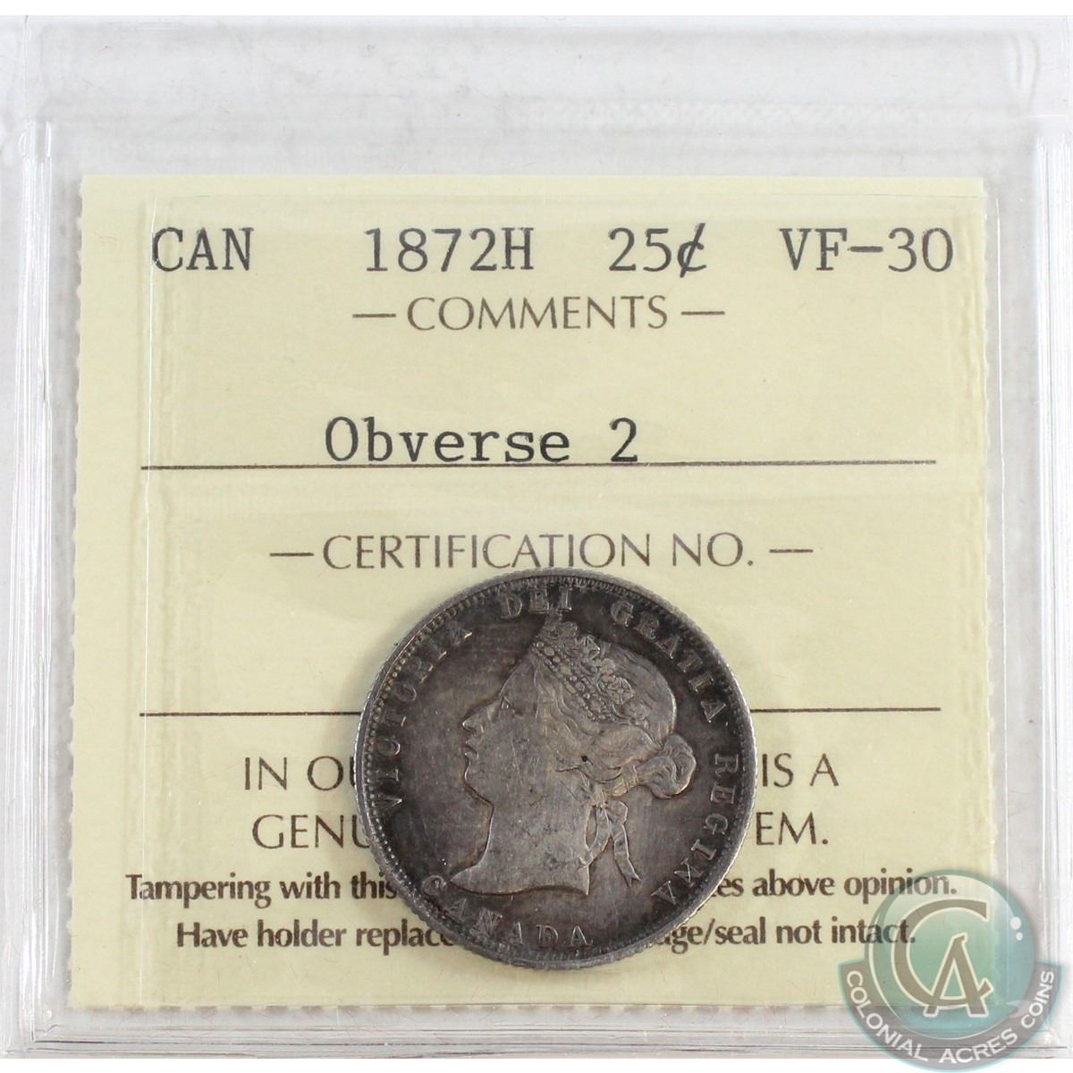 1872H Canada Obverse 2 25-cent ICCS Certified VF-30