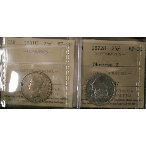 1872H Obv#2 and 1881H 25¢ both ICCS graded VF-30