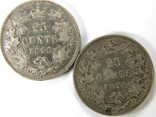 1872H Obverse 2 VF with rim dents and marks and 1874H, VF with a weak reverse, both pale toned