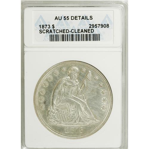 <B>1873 $1 --Cleaned, Scratched--ANACS. AU55 Details.</B></I> NGC Census: (12/85). PCGS Population (11/88). Mintage: 293,000. Numismedia Wsl. Price: $585. (#6971)<BR><BR><b>Shipping:</b> Coins & Currency (<a target="_blank" href="http://www.heritageauctions.com/common/shipping.php">view shipping information</a>)