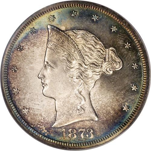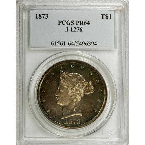 <B>1873 $1 Coronet Head Trade Dollar, Judd-1276, Pollock-1418, R.5, PR64 PCGS.</B></I> A bust of Liberty faces left with her hair tied in a bun, wearing a beaded coronet inscribed LIBERTY. Along the border are 13 stars with the date below. An olive wreath on the reverse is tied at the bottom with a ribbon inscribed IN GOD WE TRUST. Inside the wreath is the denomination and composition: TRADE DOLLAR 420 GRAINS, 900 FINE. The statutory legend UNITED STATES OF AMERICA is placed along the upper border outside the wreath. Struck in silver with a reeded edge. This delightful proof has fully mirrored fields that are enhanced by light gold toning on the obverse and peripheral sea-green color on both sides.<BR><I>From The Jones Beach Collection.</B></I><BR><BR><b>Shipping:</b> Coin/Currency (<a target="_blank" href="http://www.heritageauctions.com/common/shipping.php">view shipping information</a>)