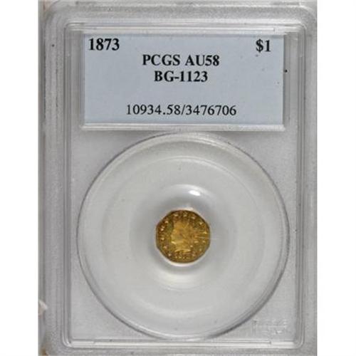 <B>1873 $1 Indian Octagonal 1 Dollar, BG-1123, High R.4, AU58 PCGS.</B></I> PCGS Population (5/40). NGC Census: (2/3). (#10934)<BR><BR><b>Shipping:</b> Coins & Currency (<a target="_blank" href="http://www.heritageauctions.com/common/shipping.php">view shipping information</a>)