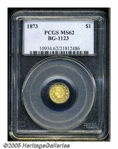 <B>1873<$1> Indian Octagonal 1 Dollar, BG-1123, High R.4, MS62 PCGS.</B></I> Dusky yellow-green patina graces this typically struck but relatively unabraded example. The apple-green fields are mildly prooflike. Several stars are repunched, most notably star 10. Population: 15 in 62, 17 finer (5/05).