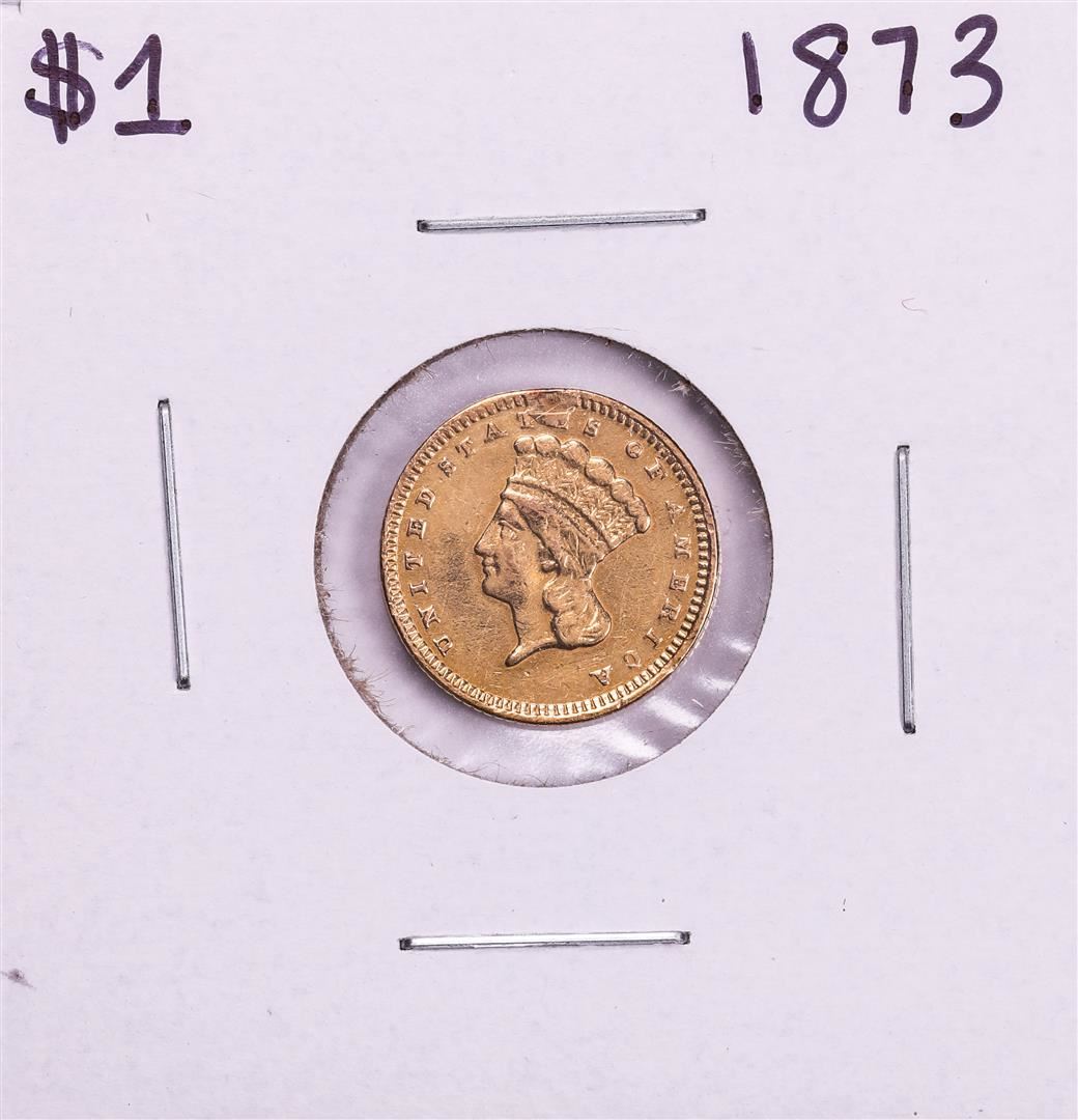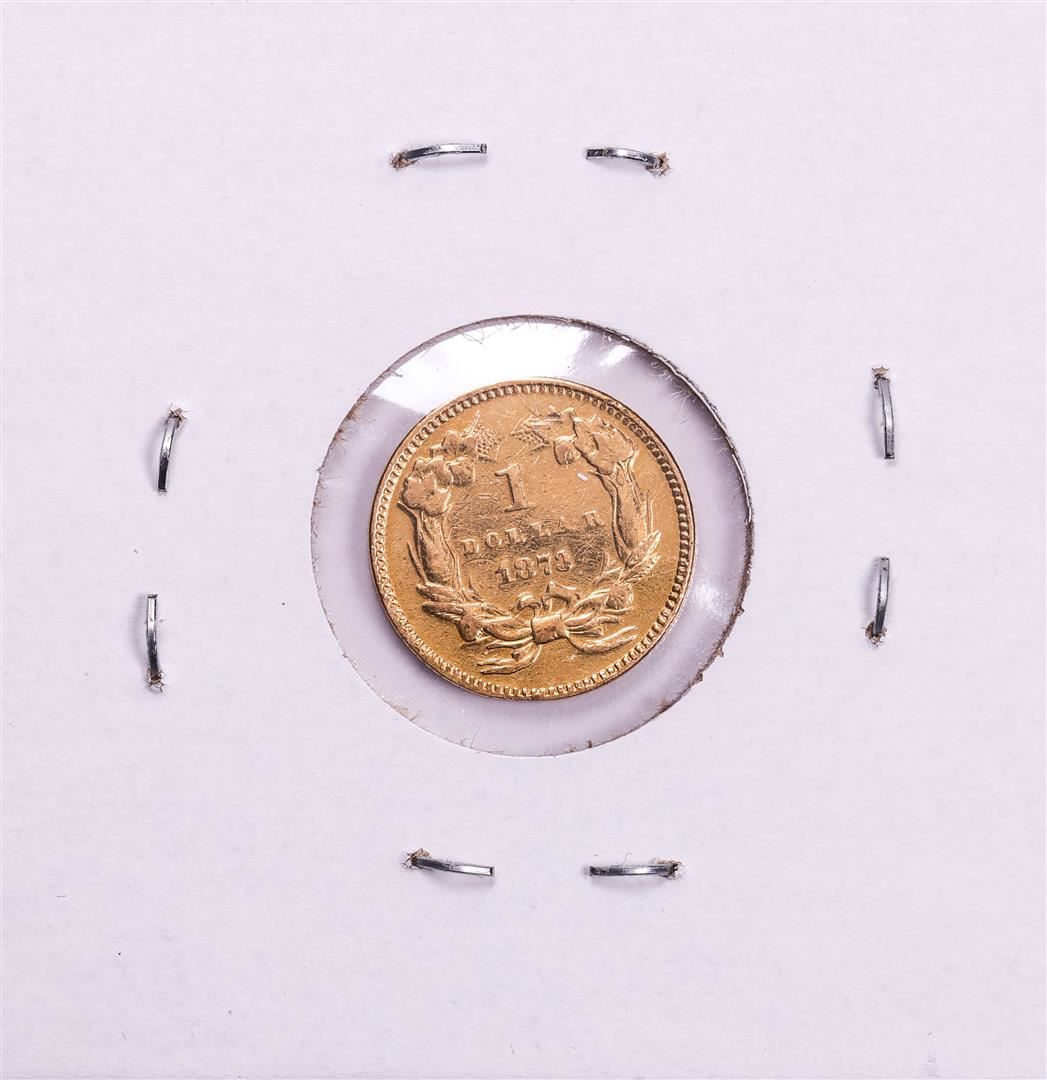 One 1873 $1 Indian Princess Head Gold Dollar Coin, please note there is some damage on the obverse of the coin at the 12 O'clock position.