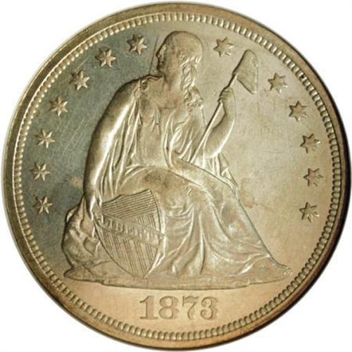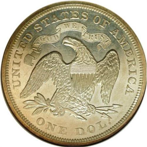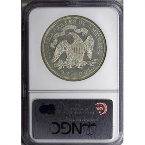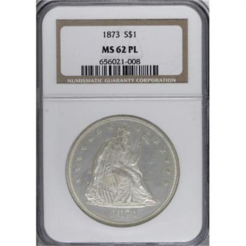 <B>1873 $1 MS62 Prooflike NGC.</B></I> A reflective example of this conditionally rare final year issue; production was interrupted by authorization of the Trade dollar. The strike is good, if not quite full on Liberty's hair and the nearby stars. A few wispy slide marks in the fields and a faint fingerprint fragment near 8 o'clock on the obverse are not troubling for the grade. NGC has certified 127 examples of the business strike 1873 (as of 8/07), but only this piece has received a Prooflike designation. <BR><BR><B>Coin Engraver:</B> Christian Gobrecht<BR><BR><b>Shipping:</b> Coins & Currency (<a target="_blank" href="http://www.heritageauctions.com/common/shipping.php">view shipping information</a>)
