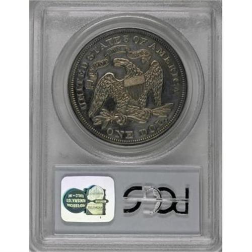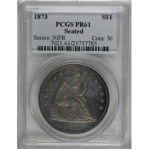 <B>1873 $1 PR61 PCGS.</B></I> This is the final year of issue for the Seated dollar series, coined continuously since 1840, after the 1836 Gobrecht design. Both sides have moderate hairlines, explaining the lower numerical grade assigned by PCGS. Population reports suggest that nearly half of the 600 coin mintage have been certified, but the figures included a substantial number of resubmissions.<I><BR>From The Beau Clerc Collection.</B></I><BR><BR><B>Coin Engraver:</B> Christian Gobrecht<BR><BR><b>Shipping:</b> Coins & Currency (<a target="_blank" href="http://www.heritageauctions.com/common/shipping.php">view shipping information</a>)
